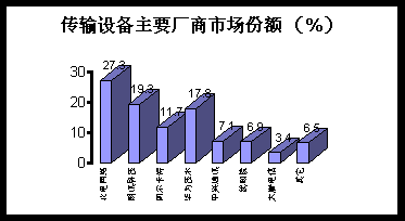 (2)市場(chǎng)特點(diǎn): 高端傳輸設(shè)備受到推崇,10G、40G、320G DWDM系統(tǒng)已成為干線網(wǎng)絡(luò)傳輸設(shè)備市場(chǎng)的主流,傳統(tǒng)的SDH設(shè)備市場(chǎng)不斷萎縮。市場(chǎng)競(jìng)爭(zhēng)激烈、市場(chǎng)集中度有所降低,盡管北電網(wǎng)絡(luò)與朗訊科技兩家獨(dú)占42%的市場(chǎng)份額,但華為技術(shù)等非外資廠商已經(jīng)以總和超過(guò)30%的市場(chǎng)份額步步緊逼。更新的技術(shù)與設(shè)備不斷涌現(xiàn),朗訊科技的光路由交換技術(shù)打開(kāi)了通往全光網(wǎng)絡(luò)之門,阿爾卡特Crosslight 光交叉連接系統(tǒng)可極為靈活地實(shí)現(xiàn)對(duì)各種光接口的支持,西門子DWDM實(shí)驗(yàn)系統(tǒng)傳輸能力已達(dá)到3.2T。