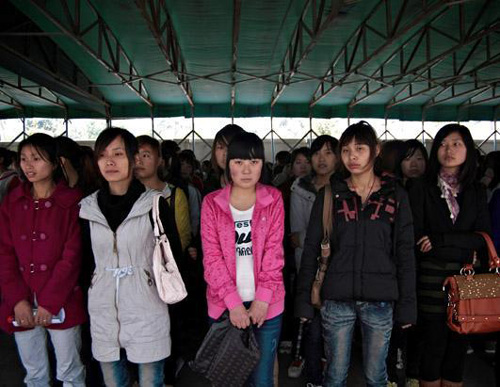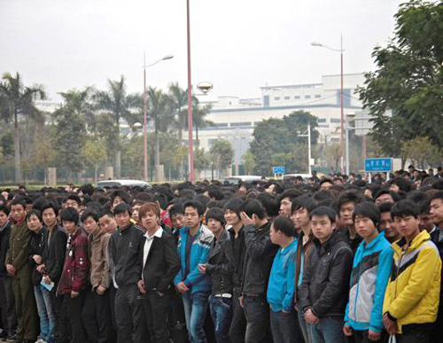 在一個周一上午,約3000名外來工人在深圳的富士康招聘中心門前,希望獲得在富士康的工作機會。
