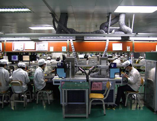 在富士康深圳觀瀾工廠,iPhone組裝線的工人在默默工作。